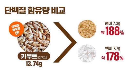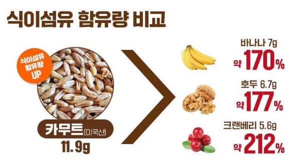 슈퍼 곡물로 불리는 카무트는 고대 이집트에서부터 재배된 원시 곡물로, 고소한 맛과 쫄깃한 식감이 특징이다. 또한 단백질이나 식이섬유, 미네랄, 셀레늄 등의 영양소가 일반 밀보다 풍부하다. 카무트 효소가 신진대사와 소화를 돕는다고 알려지면서 최근 방송이나 언론을 통해 많은 관심을 받고 있습니다.